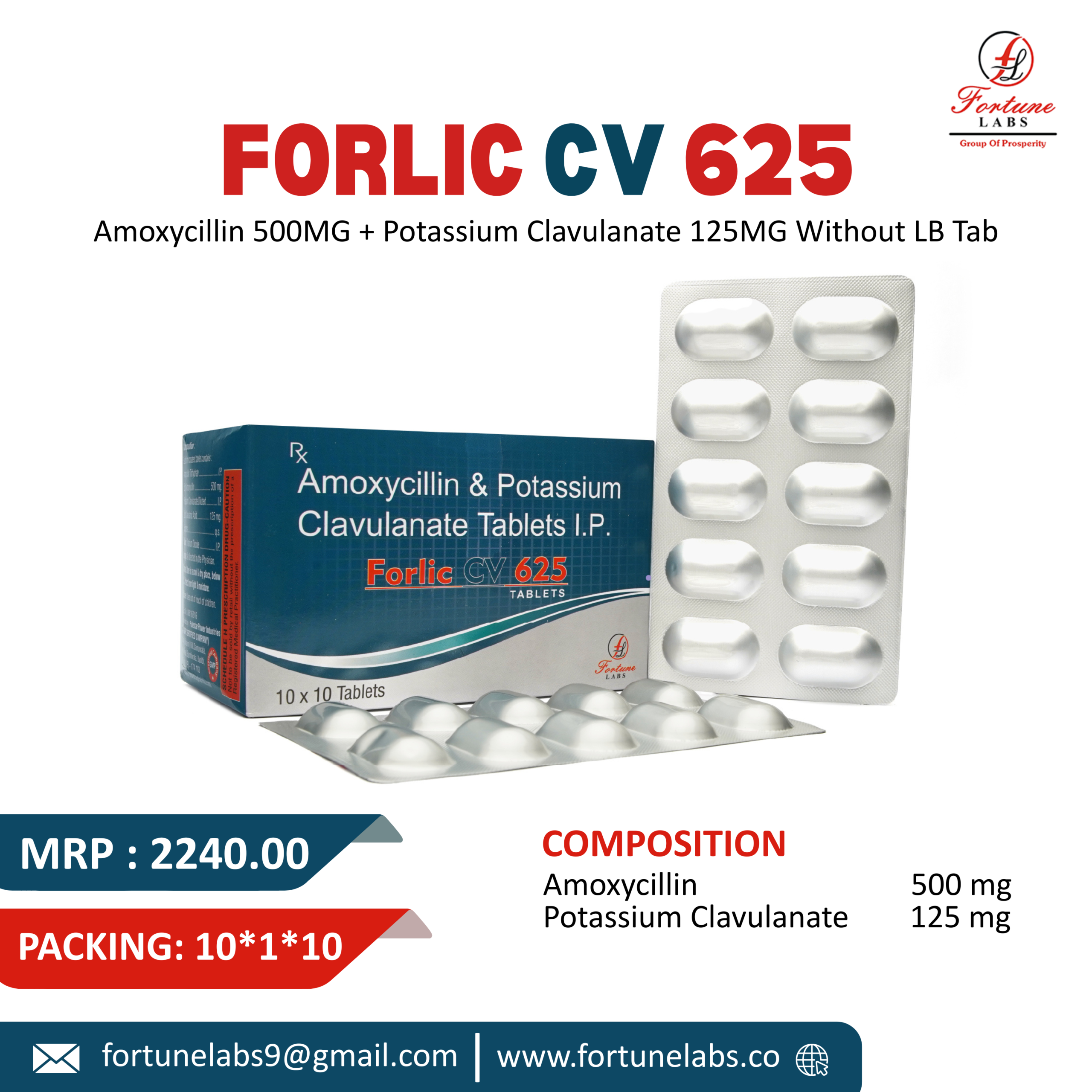 FORLIC-CV-625 Tablet is a penicillin type of antibiotic composed of Amoxycillin and Potassium Clavulanate that helps our body fight infections caused by bacteria. The main role of the medicine is to treat infections of the lungs (e.g., pneumonia), ear, nasal sinus, urinary tract, skin, and soft tissue. Although it does not work for viral infections such as the common cold. Fortune Labs is a trusted manufacturer and supplier of Amoxycillin and Potassium Clavulanate tablets that are also offered for PCD Pharma Distributorship across India.