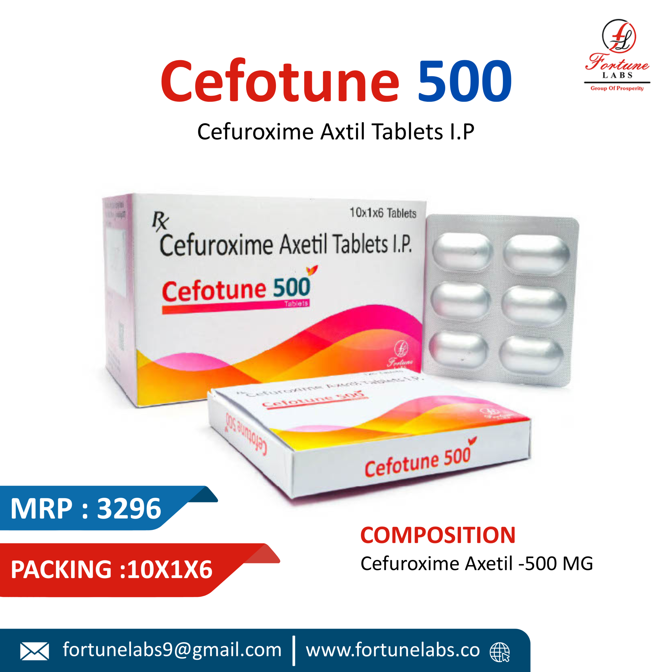 Cefuroxime Axetil -500MG – This medicine is used to treat bacterial infections. It cures a lot of bacterial infections. The medication is known as a cephalosporin antibiotic. The sole aim of medicine is to stop the growth of bacteria. Most importantly this antibiotic treats only bacterial infections. Fortune Labs manufactures the medicine by the name of CEFOTUNE-500. The medicine is available in different mgs. And is given to the patients according to the medical condition of the patient.
