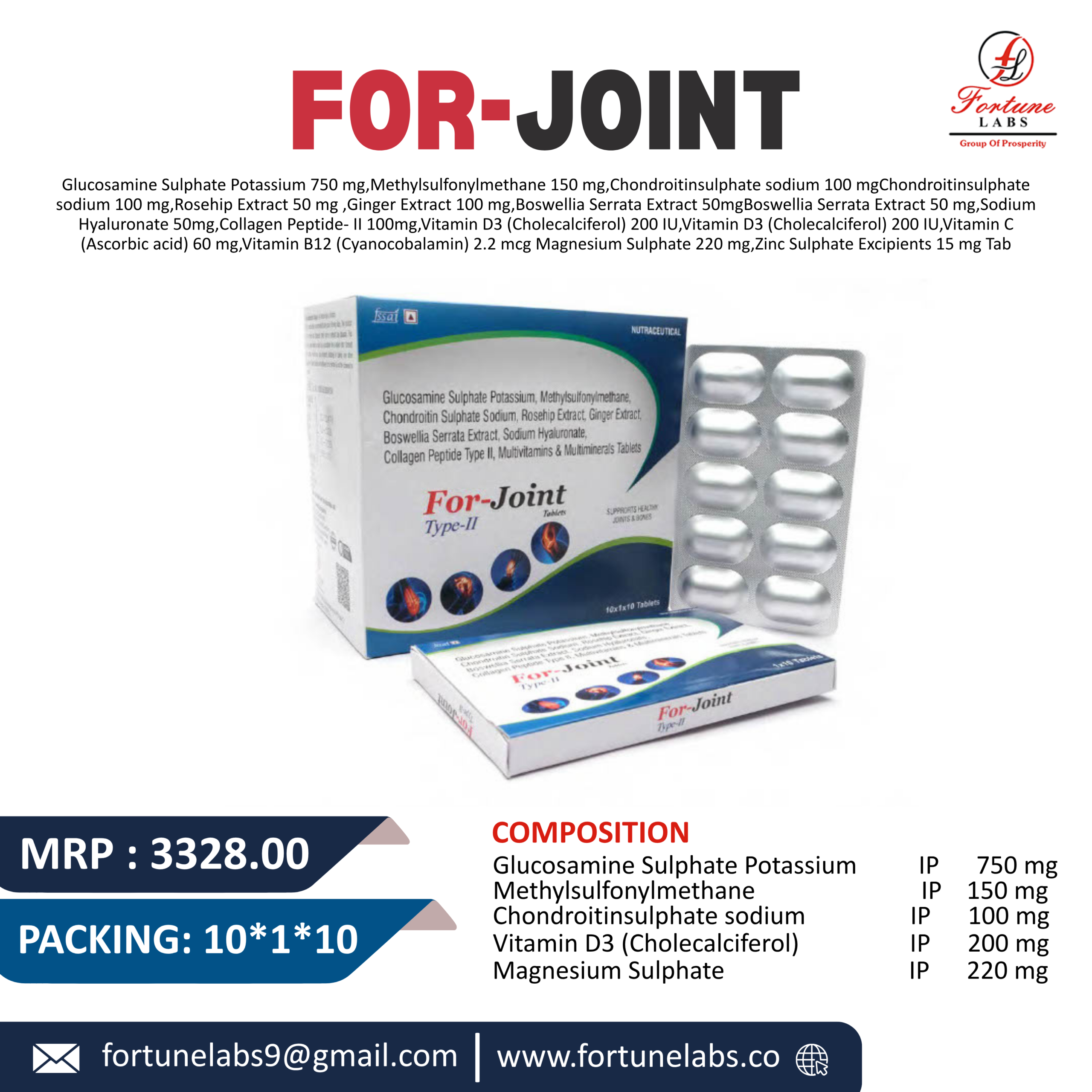 Glucosamine Sulphate Potassium, Methylsulfoxyl Methane, Chondroitin Sulphate Sodum, Rosehip Extract, Ginger Extract, Boswella Serrata Extract, Sodium Hyaluronate, Collagen Peptide Type II, Multivitamins & Multimineral Tablets - PCD Pharma Distributorship