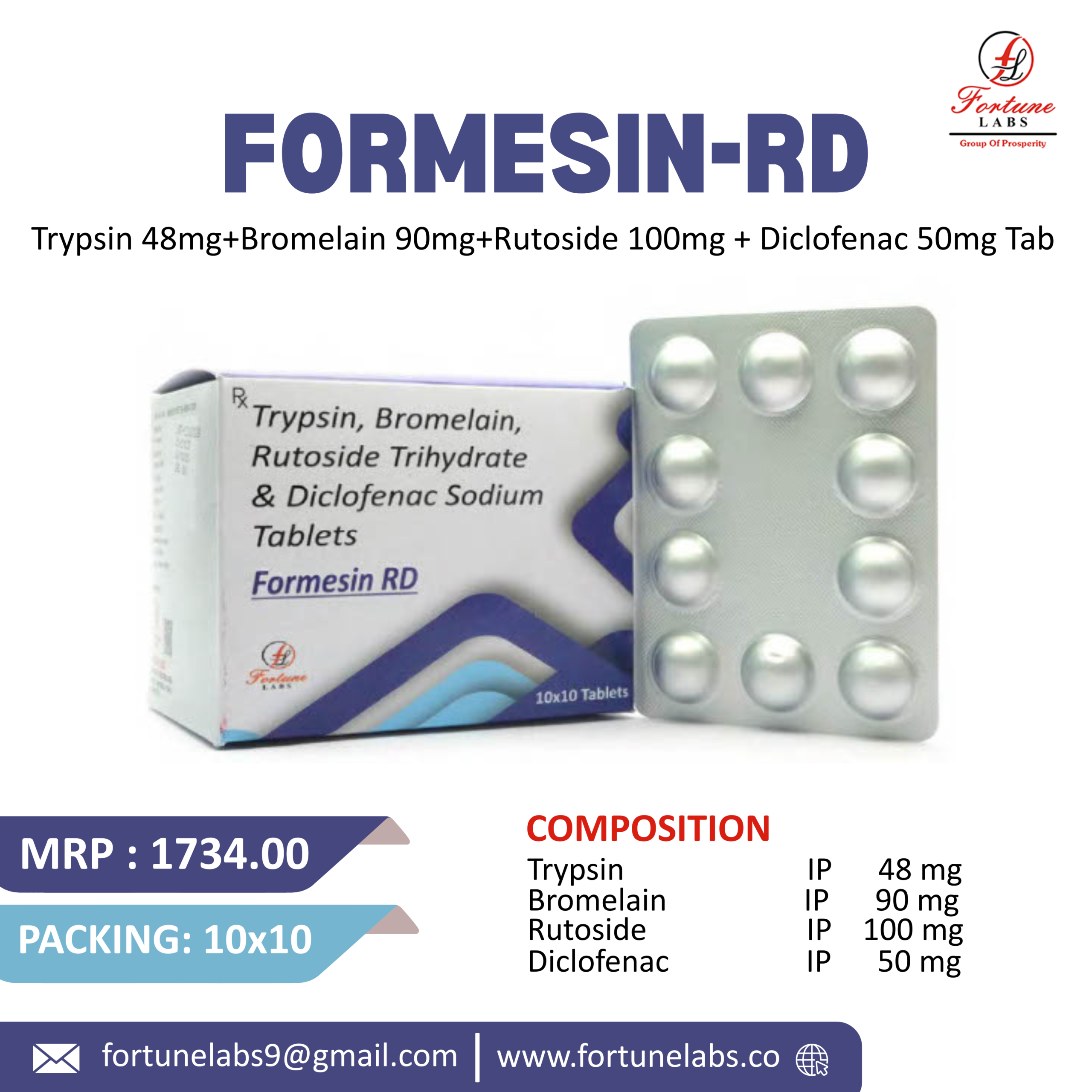 Trypsin 48MG+Bromelin 90MG+Rutoside 100MG + Diclofenac 50MG – This medicine is a combination of four formulations that are Trypsin, Bromelin, Rutoside, and Diclofenac. The tablet is a pain relieving medicine. It is used to reduce pain and inflammation in conditions like rheumatoid arthritis, ankylosing spondylitis, and osteoarthritis. It may also be used to relieve fever, muscle pain, back pain, toothache, or pain in the ear and throat.